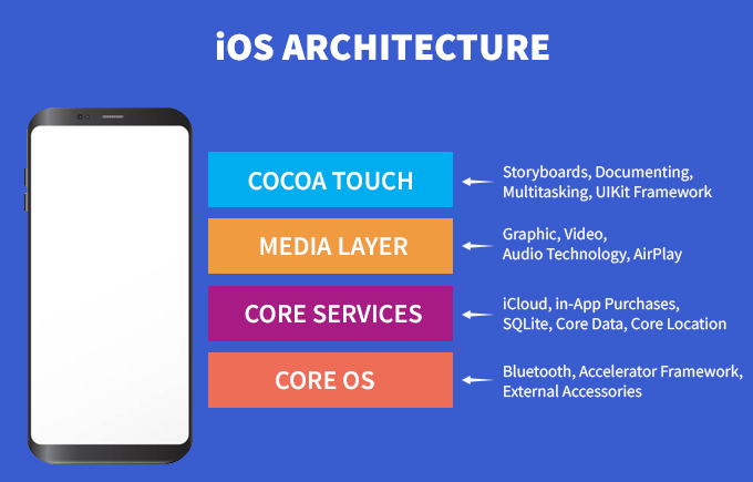 iOS works in a Layered structure. iOS Architecture comprises four layers, each of which presents a programming framework for developing applications that operate on top of the hardware. The layers between the Application Layer and the Hardware Layer will enhance communication. A lower-level layer provides the services that all applications need, while an upper-level layer (or high-level layer) provides graphics and interface-related services.